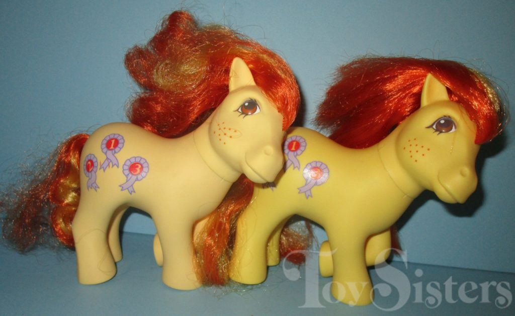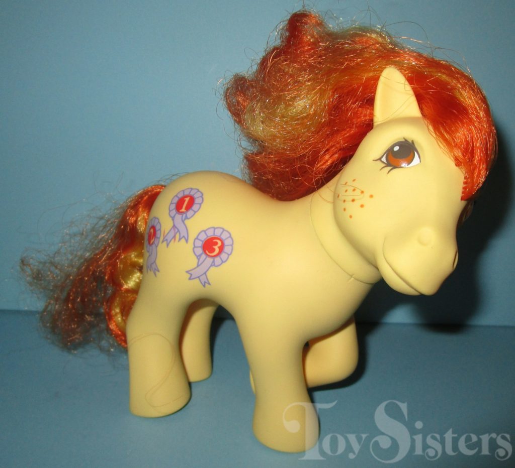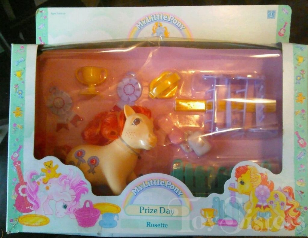 Rosette was released in Europe. She came in the Prize Day set. She came with a yellow heart clip brush, a yellow trophy, four purple jump stand, two purple prize ribbons, two yellow jump bars, a purple ribbon, soup on a rope, and teal fence. She is in the Tootsie Pose. To view other ponies by year/series, click here.