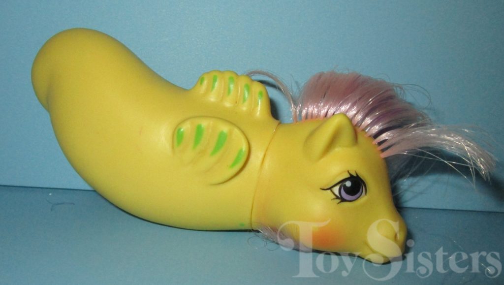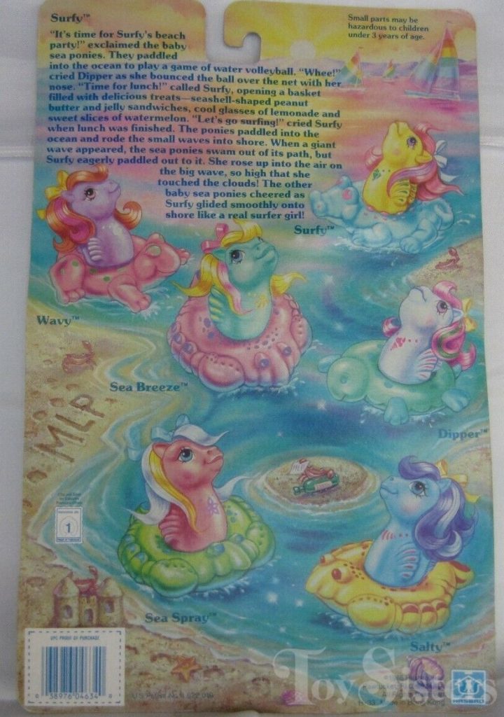 Surfy was released in 1987 and is a Baby Sea Pony. She came with a ribbon, green fish comb, and blue alligator float. She is in the Baby Foamy Pose. To view other ponies by year/series, click here.