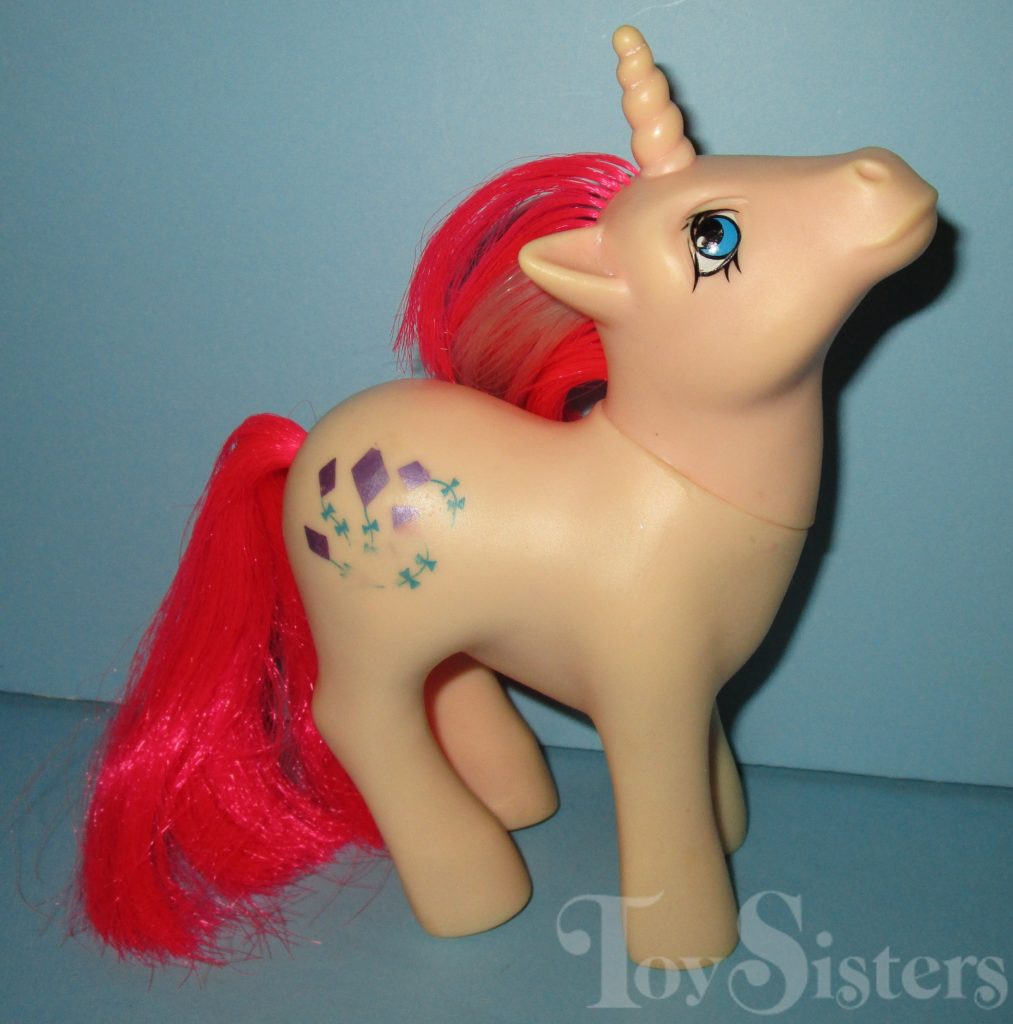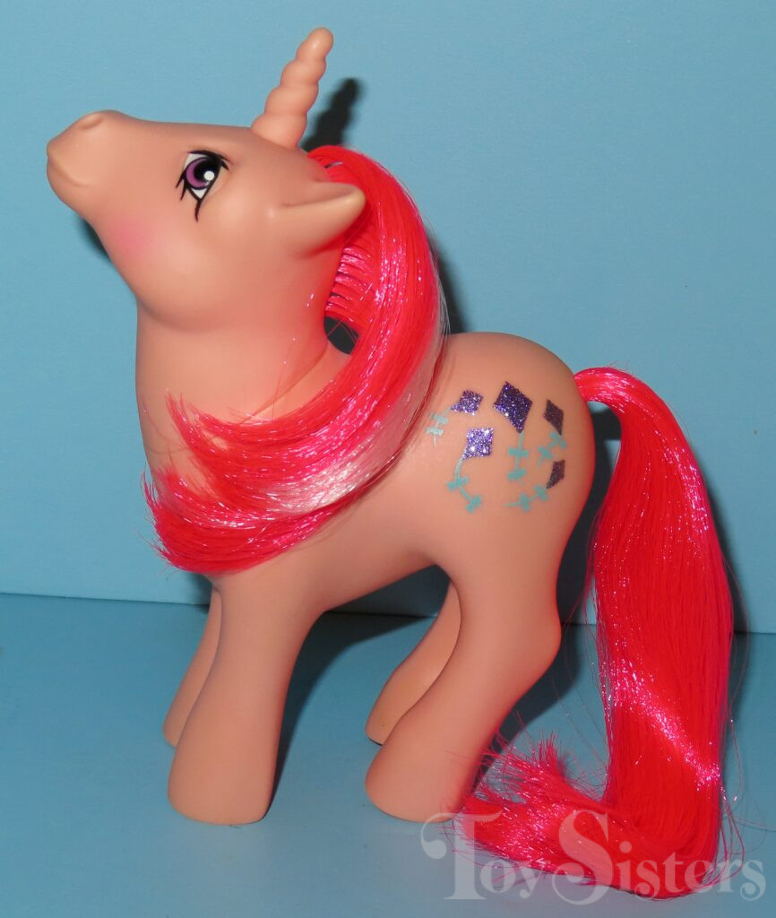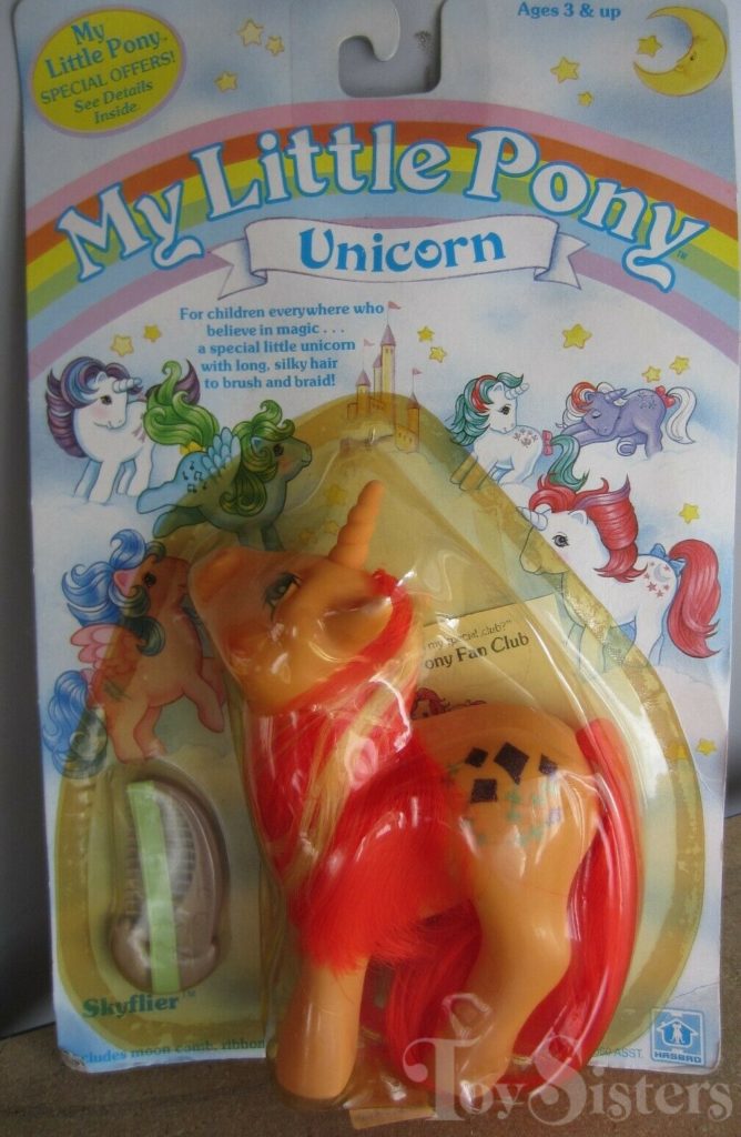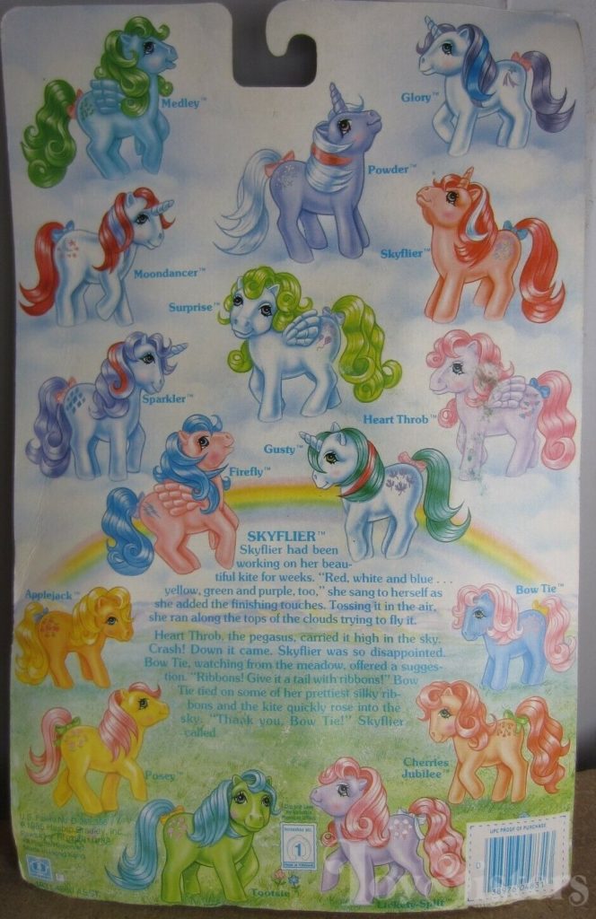 Skyflier was released in 1984 and is a Unicorn Pony. She came with a purple moon comb and teal ribbon. She is in the Powder Pose. To view other ponies by year/series, click here.