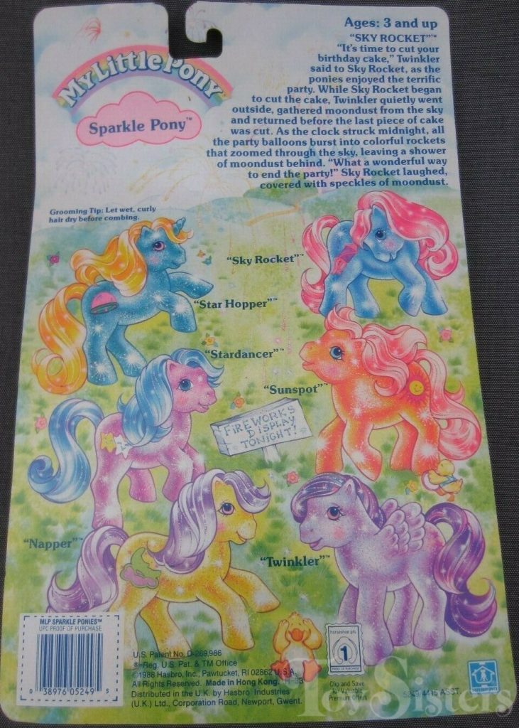 Sky Rocket was released in 1989 and is a Sparkle Pony. She came with a purple star comb. She is in the Cupcake Pose. To view other ponies by year/series, click here.