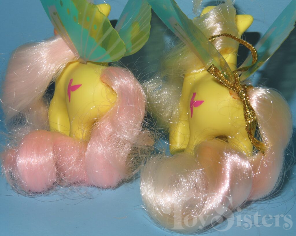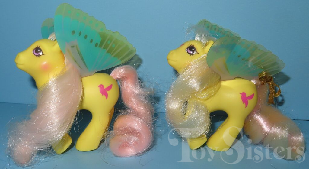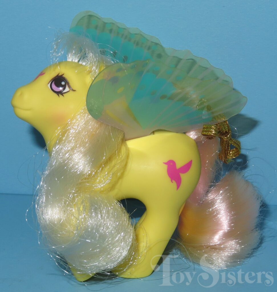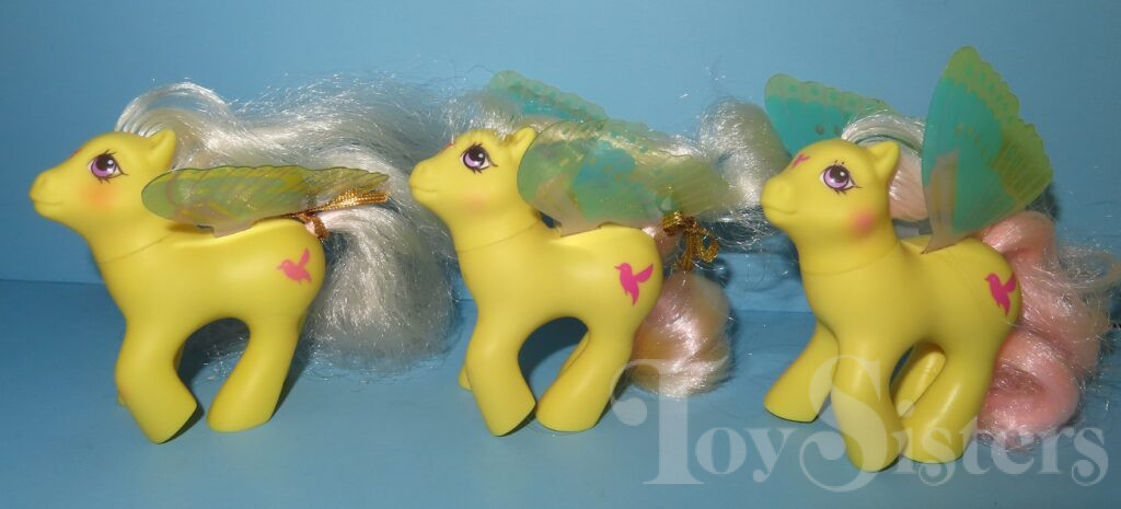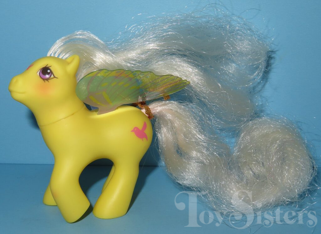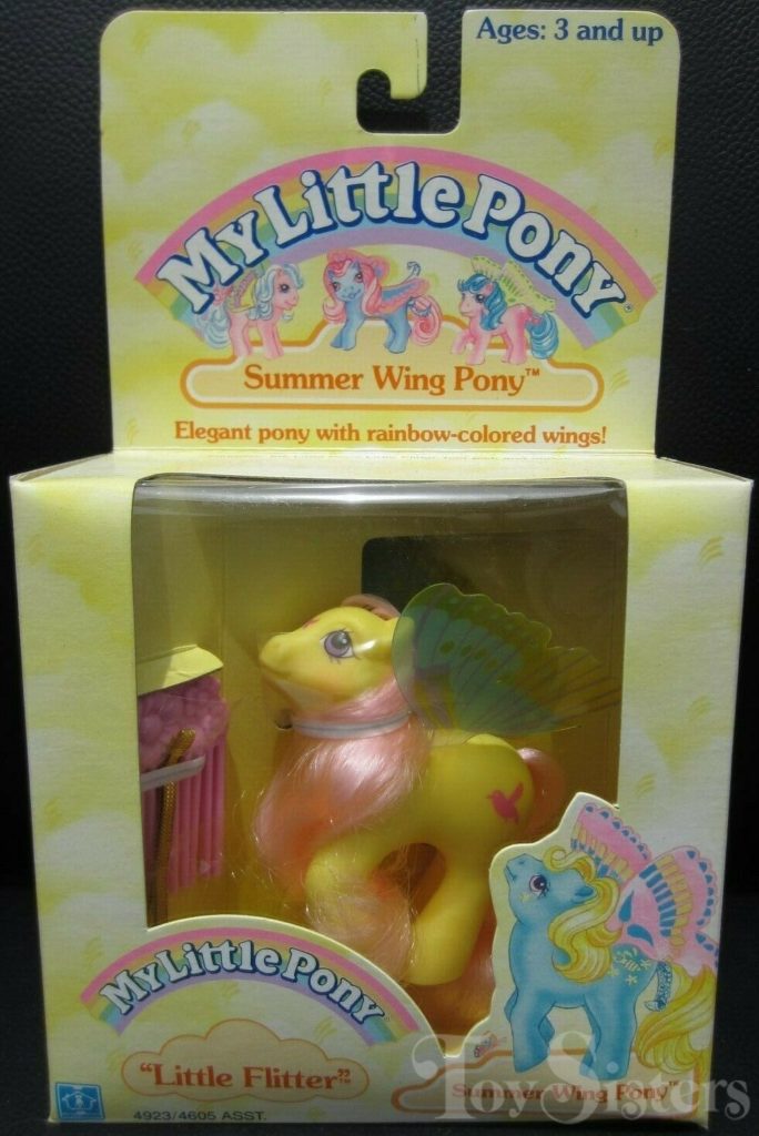 Little Flitter was released in 1988 and is a Summer Wing Pony. She can be found both made in China and made in Hong Kong. I have seen two different hair textures on Made in China releases. She came with a gold ribbon and pink flower comb. She is in the Flurry Pose. To view other ponies by year/series, click here.