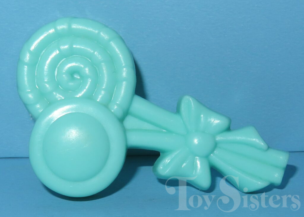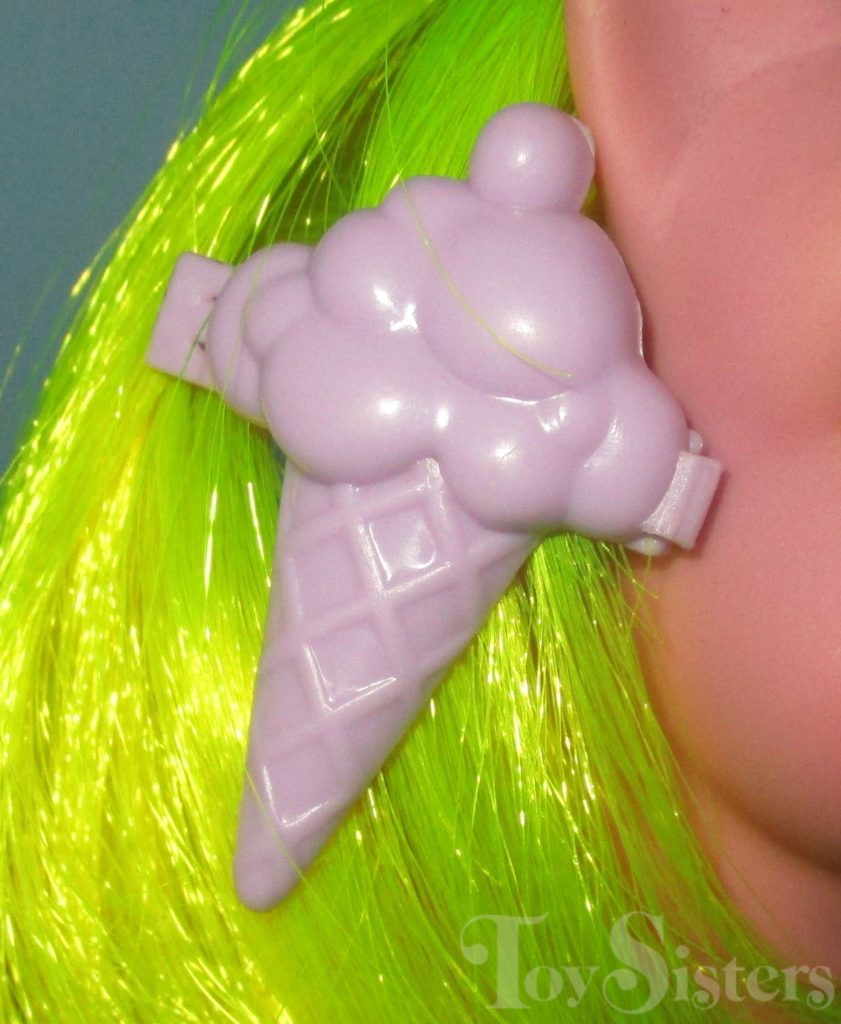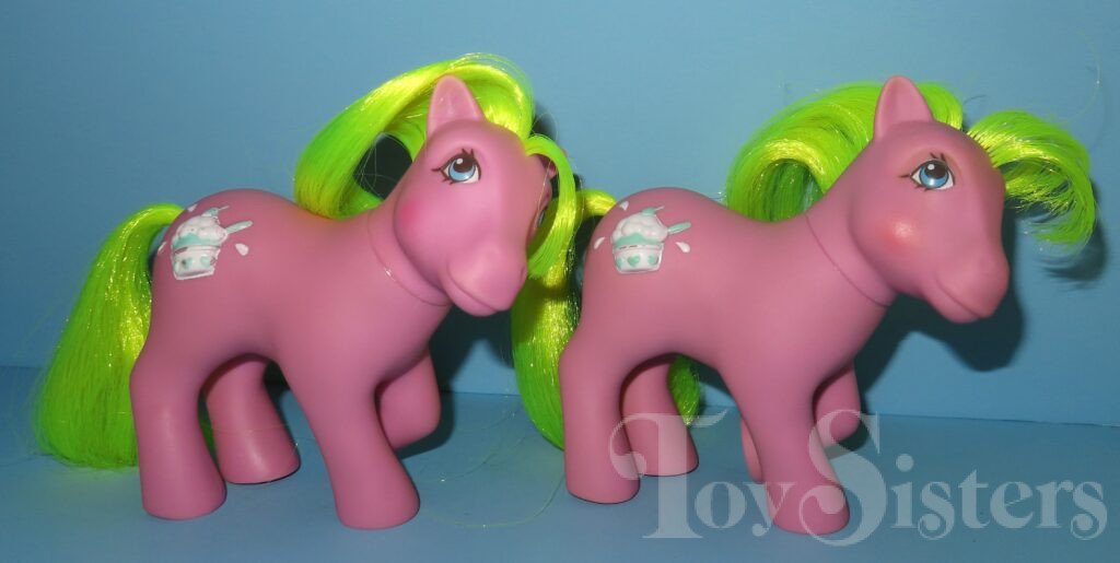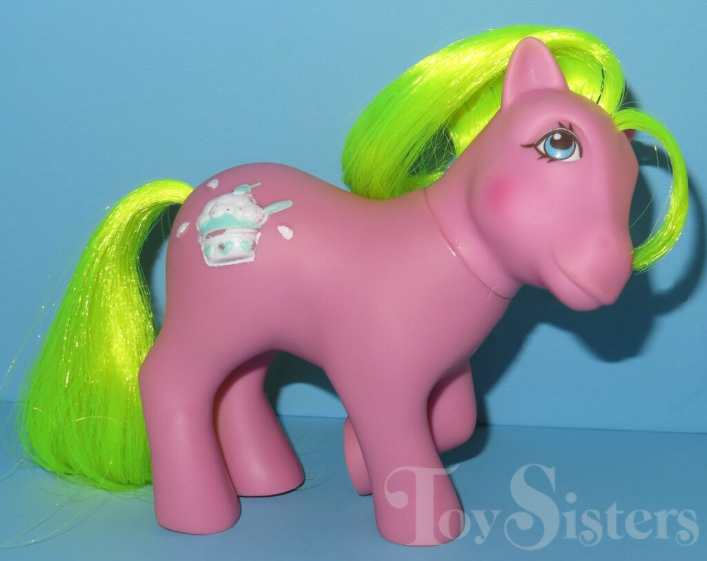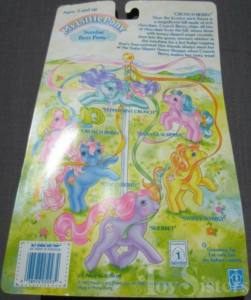 Crunch Berry was released in 1988 and is a Sundae Best Pony. She came with a magenta ice cream barrette, aqua lollipop brush, and pink ribbon. In the United States she was made in Hong Kong. In Europe, she can be found made in China. She is in the Tootsie Pose. To view other ponies by year/series, click here.