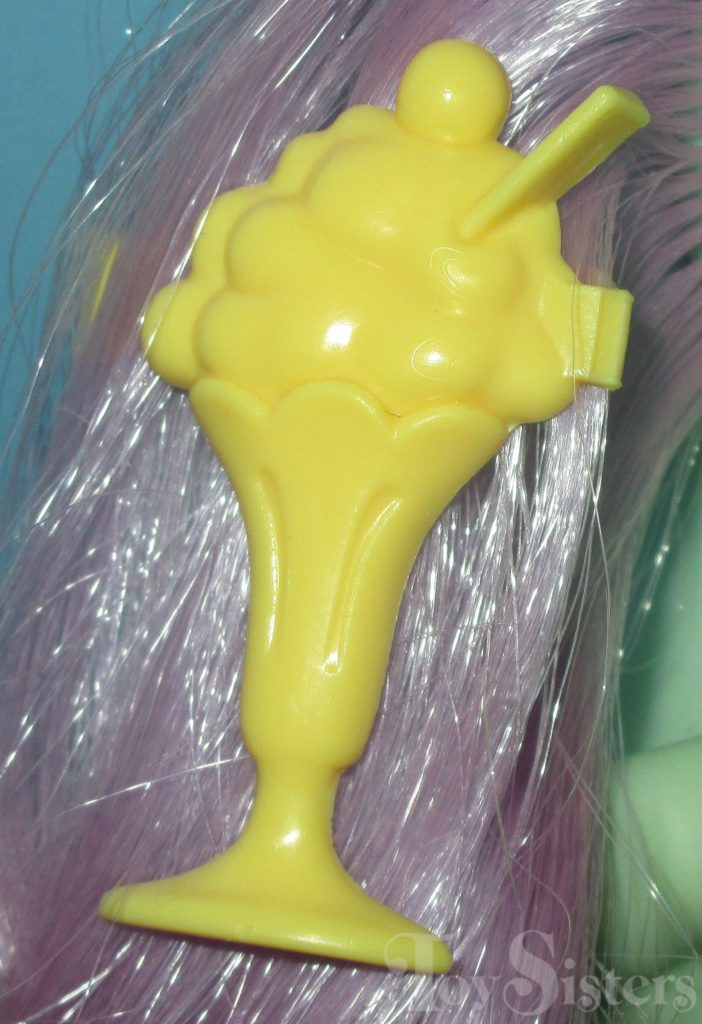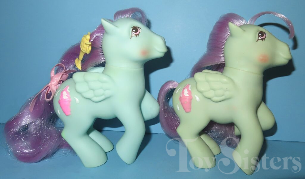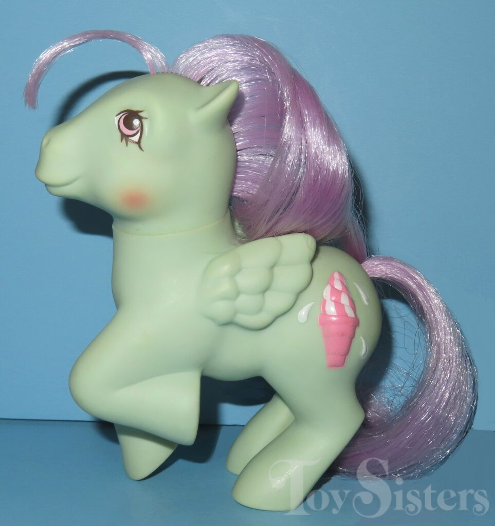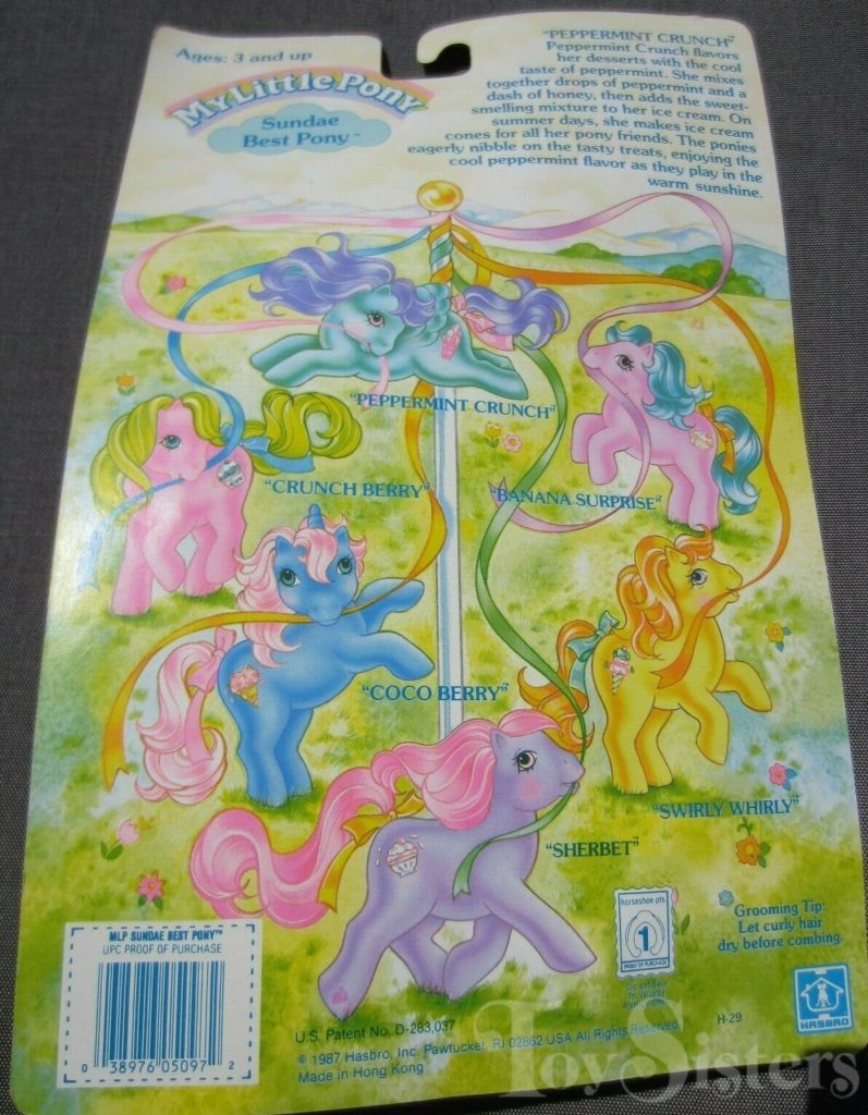Peppermint Crunch was released in 1988 and is a Sundae Best Pony. She came with a yellow ice cream soda barrette, blue lollipop brush, and pink ribbon. She was usually made in Hong King but a made in China version was sold in Germany. She is in the Firely Pose. To view other ponies by year/series, click here.