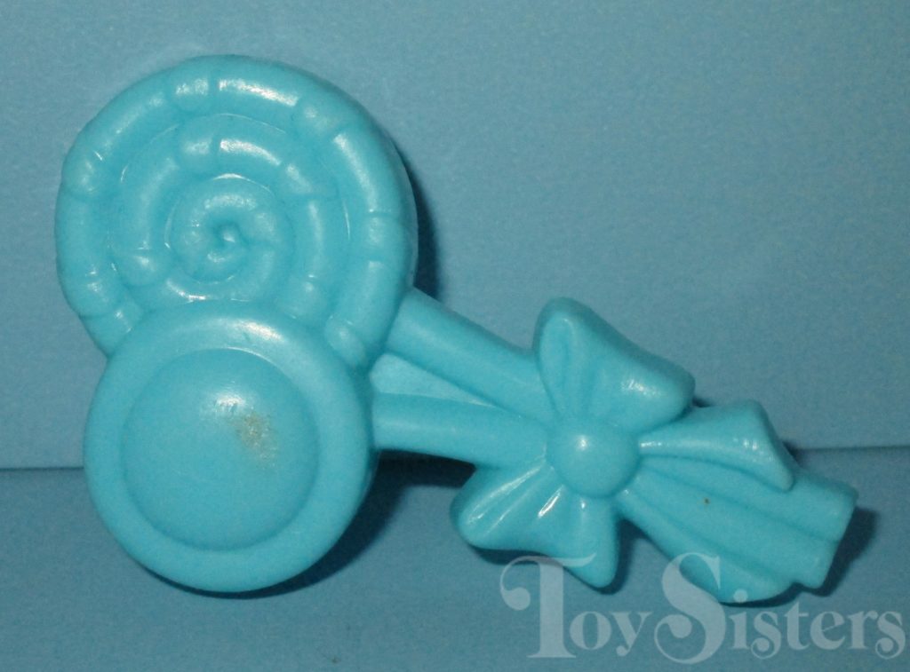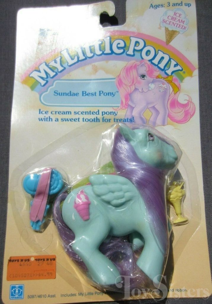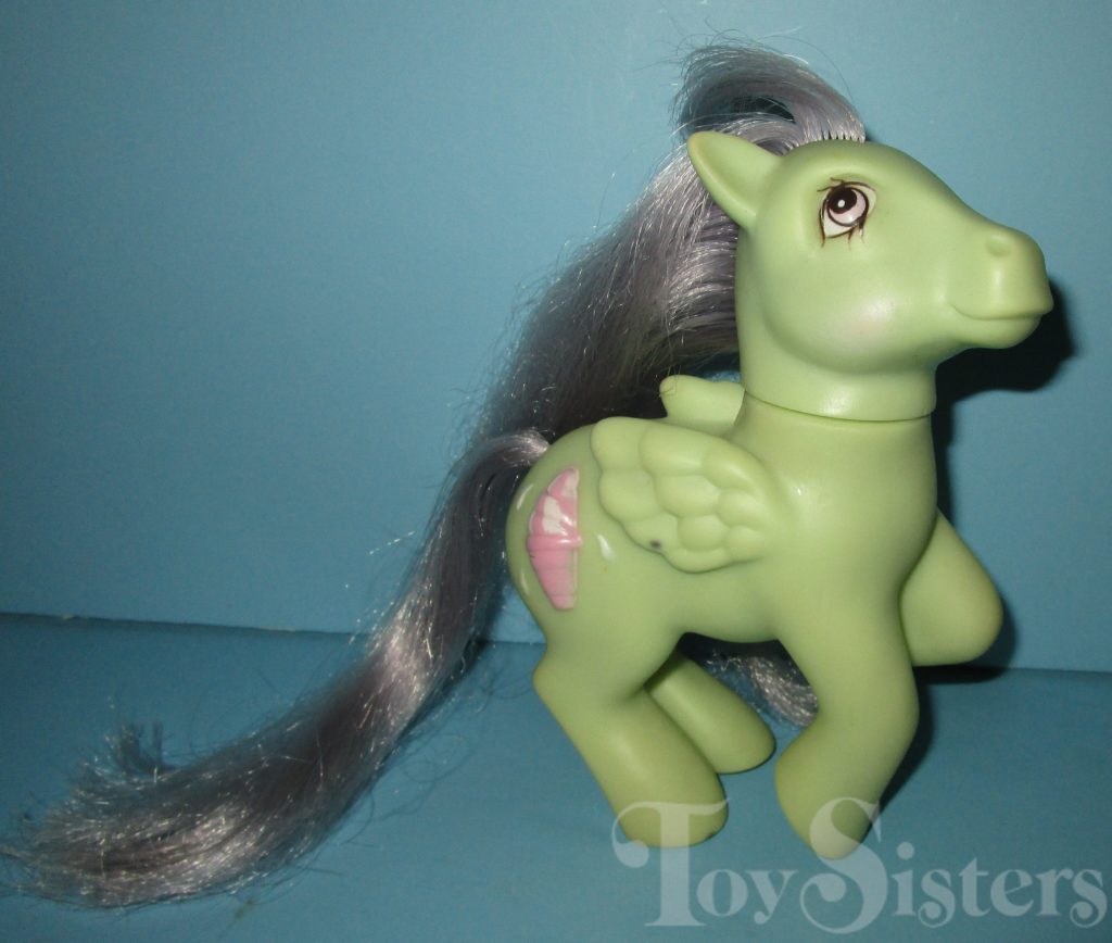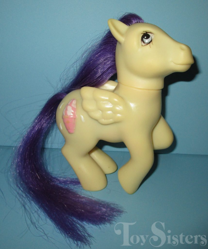 Peppermint Crunch was released in 1988 and is a Sundae Best Pony. She came with a yellow ice cream soda barrette, blue lollipop brush, and pink ribbon. She was usually made in Hong King but a made in China version was sold in Germany. She is in the Firely Pose. To view other ponies by year/series, click here.