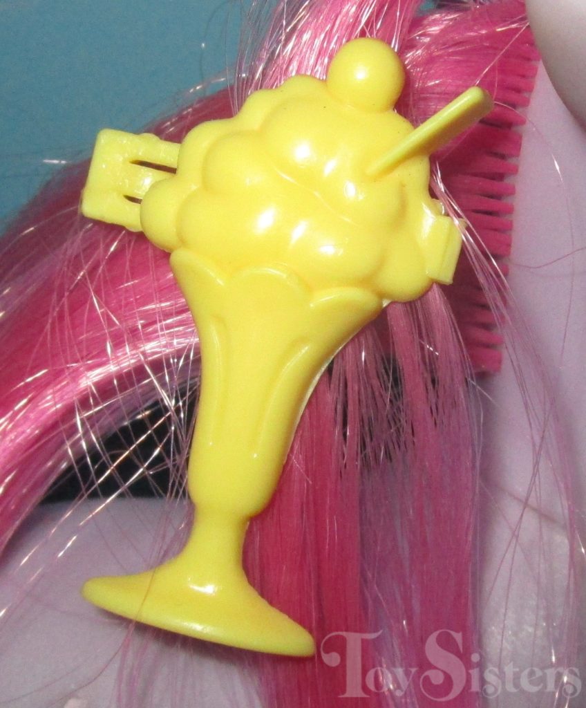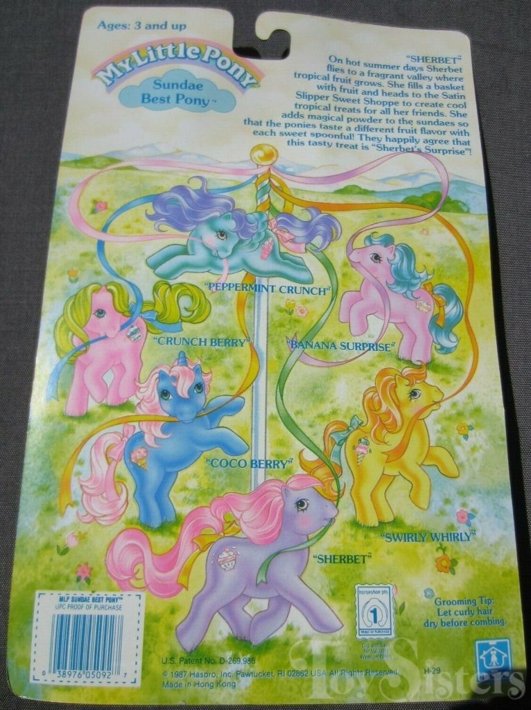 Sherbet was released in 1988 and is a Sundae Best Pony. She came with a yellow ice cream soda barrette, a green lollipop brush, and a yellow ribbon. In the United States, she was made in Hong Kong. In Europe, she can be found made in China. Her China version has a darker body color. She is in the Posey Pose. To view other ponies by year/series, click here.
