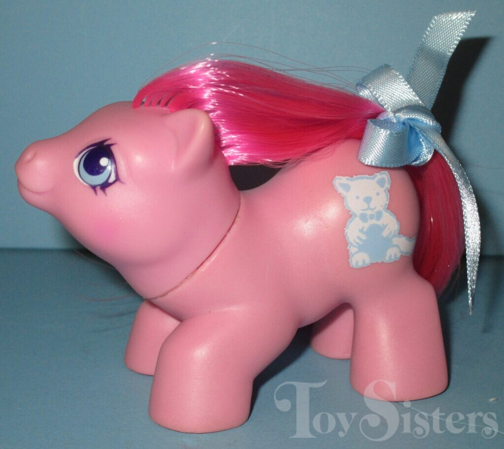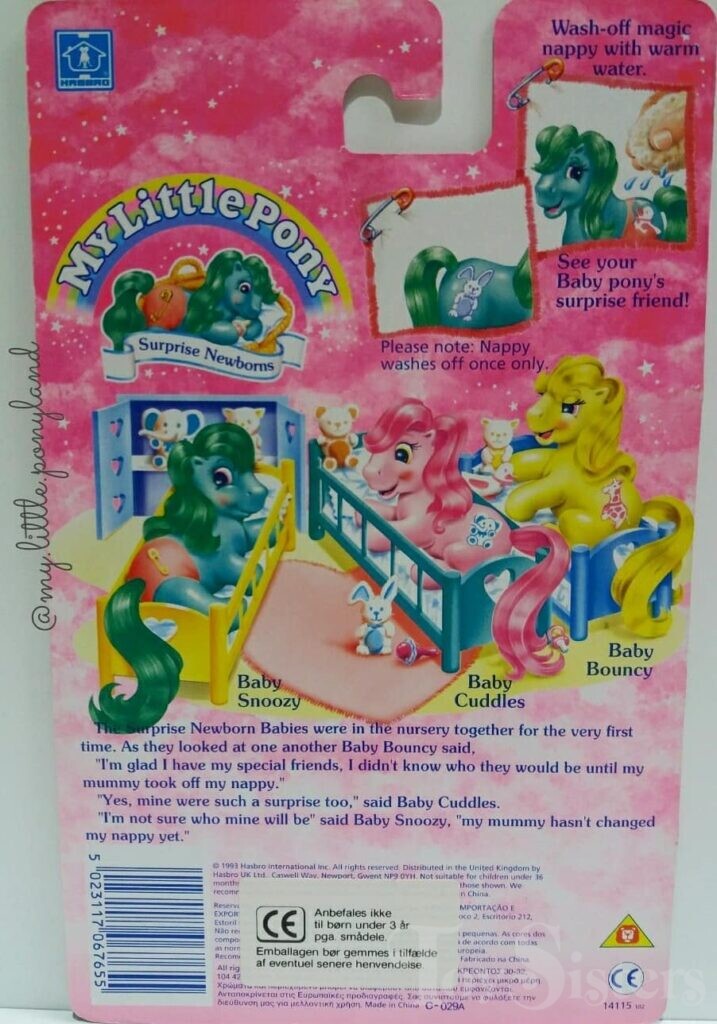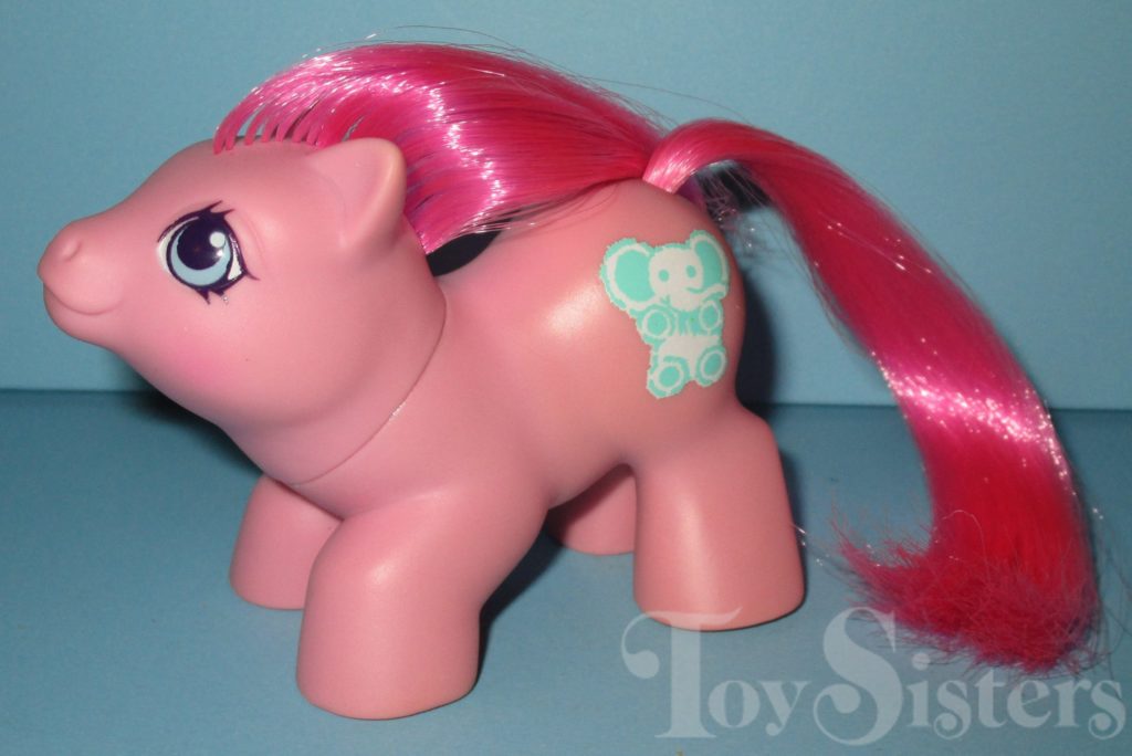 Baby Cuddles was released in Europe and is a Surprise Newborn. She came with a diaper on her that washed off to reveal either a cat or elephant symbol. She also came with a cloth teal diaper. She is in the Newborn Tappy Pose. To return to the main G1 My Little Pony menu, click here.