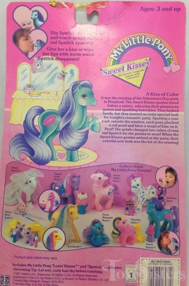Ruby Lips was released in 1992 and is a Sweet Kisses Pony. She came with a lipstick. She is in the Fancy Flower Pose. To view other ponies by year/series, click here.
