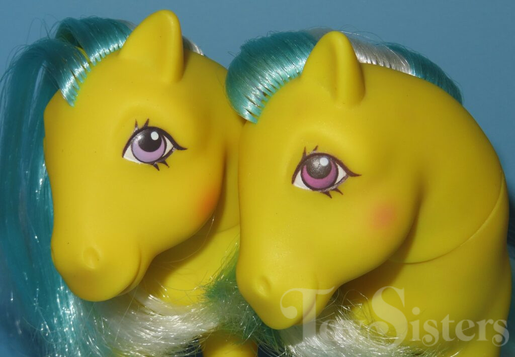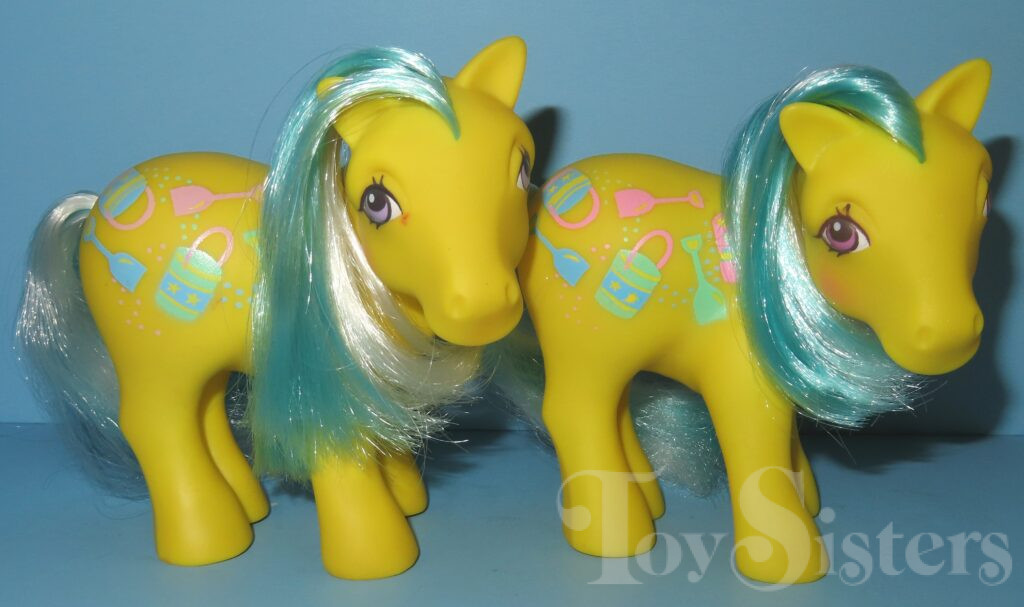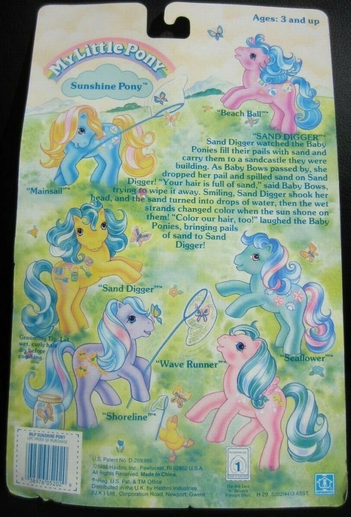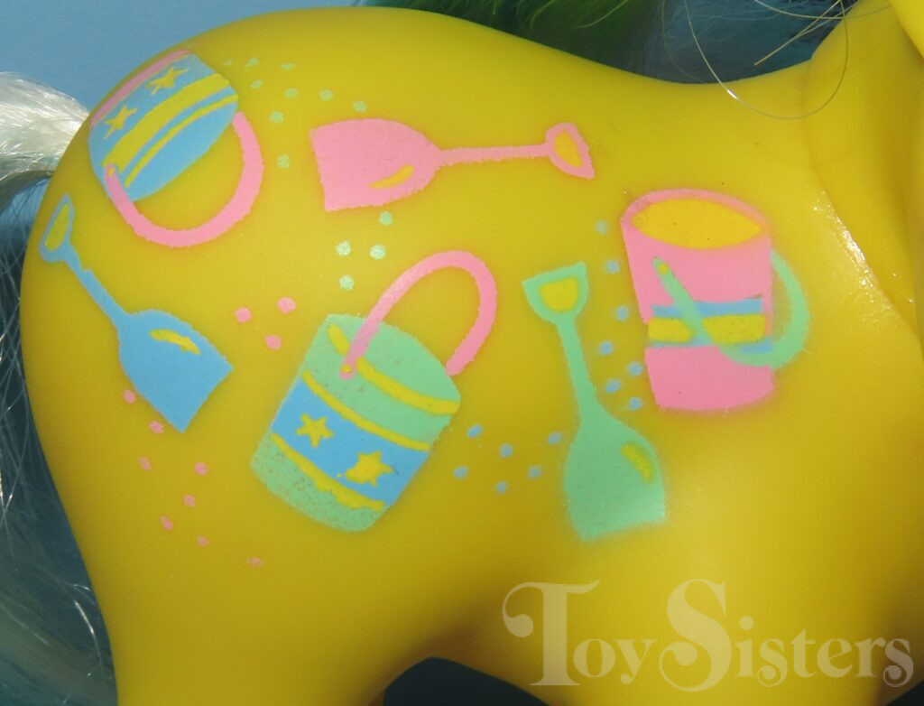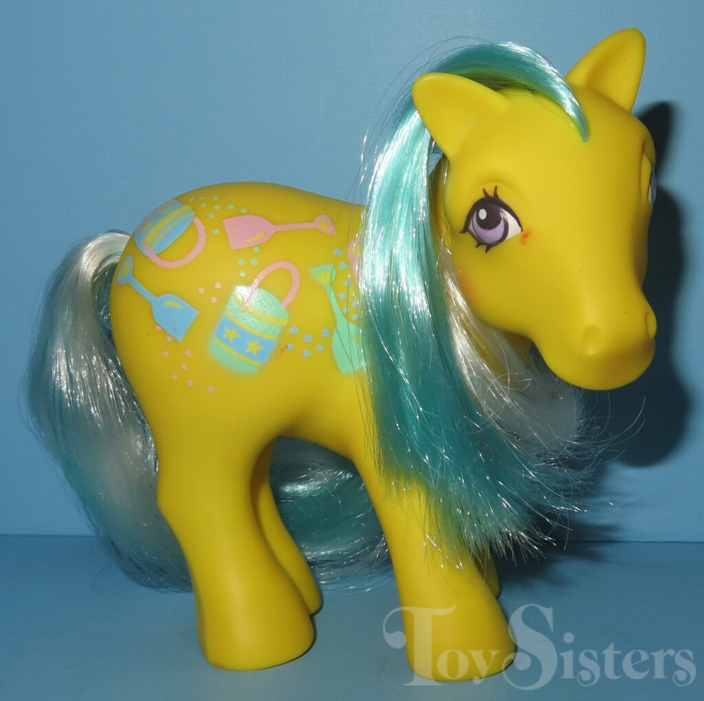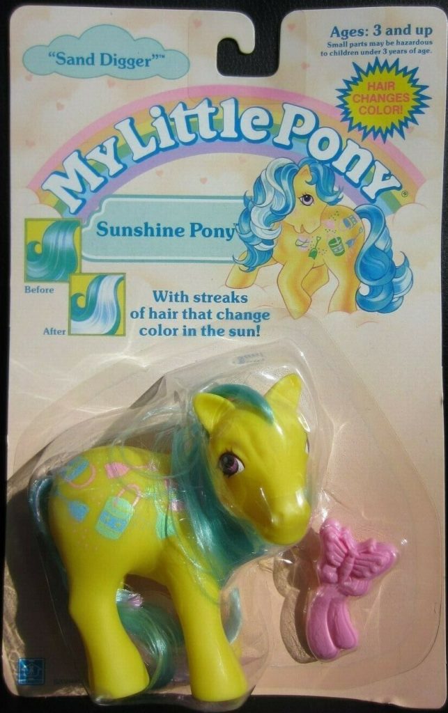 Sand Digger was released in 1989 and is a Sunshine Twice as Fancy Pony. She came with a magenta butterfly comb. Her white hair changes to magenta in sunlight. She has a pat. pending variation with lighter eyes and symbols. She is in the Sundance Pose. To view other ponies by year/series, click here.