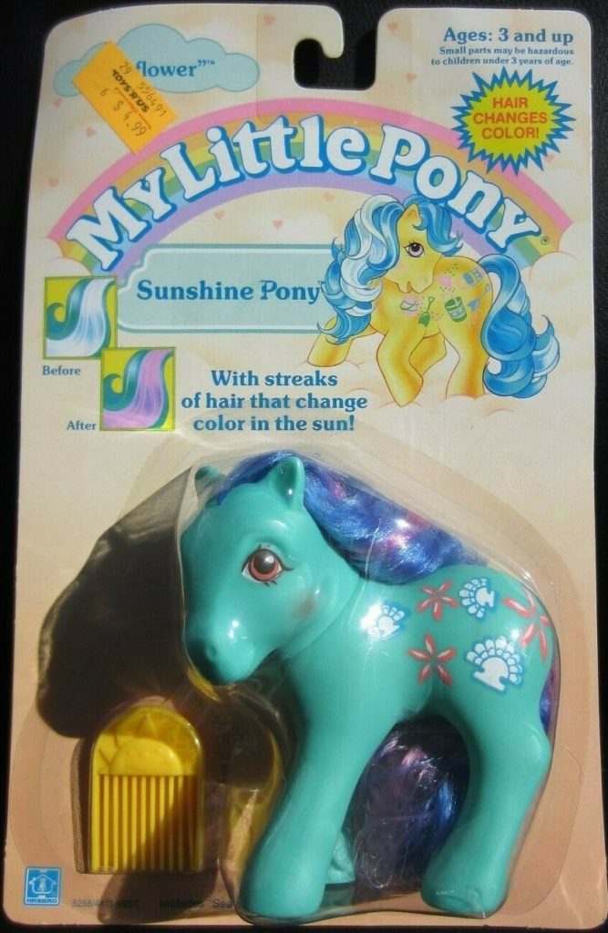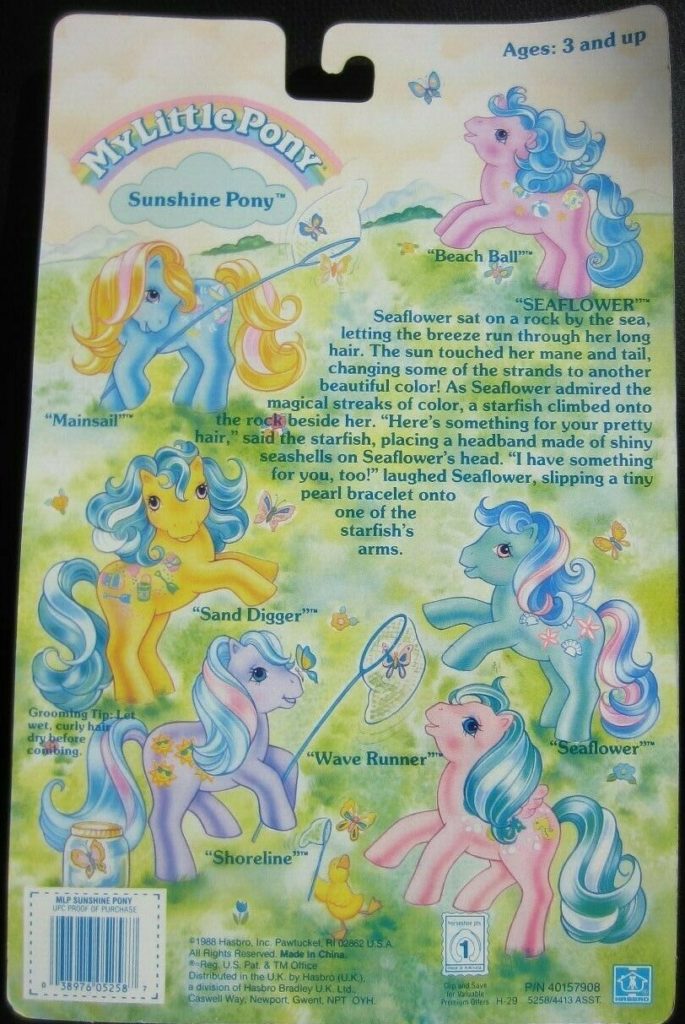 Seaflower was released in 1989 and is a TAF Sunshine Pony. She came with a yellow sun comb. Her hair changes to purple in the sunlight. She is in the Crumpet Pose. To view other ponies by year/series, click here.