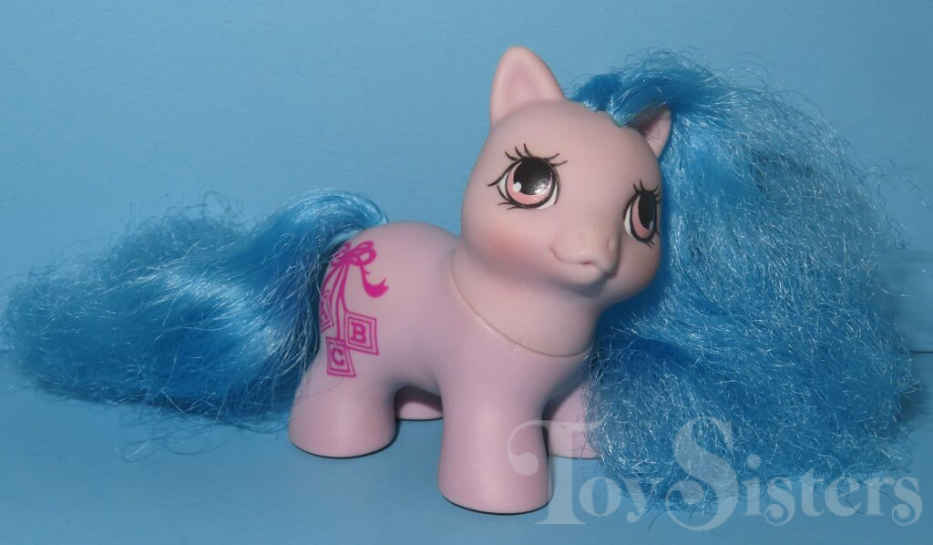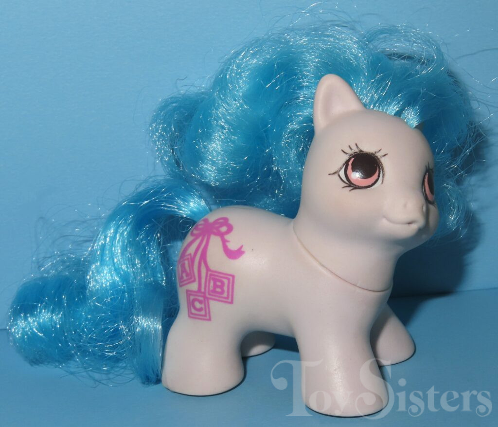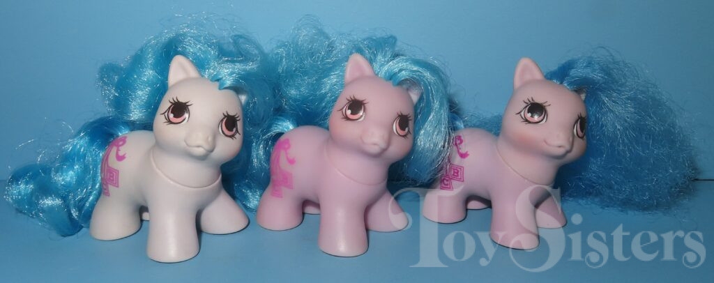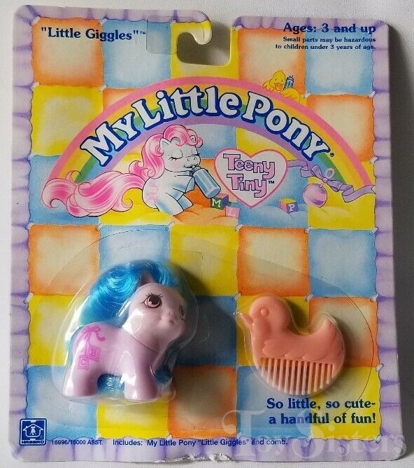 Little Giggles was released in 1991 and is a Teeny Tiny Pony. She came with a peach duck comb. She has a darker and lighter body variation. In Europe, she was released with darker hair. She is in the Teeny Tiny Giggles Pose. To view other ponies by year/series, click here.
