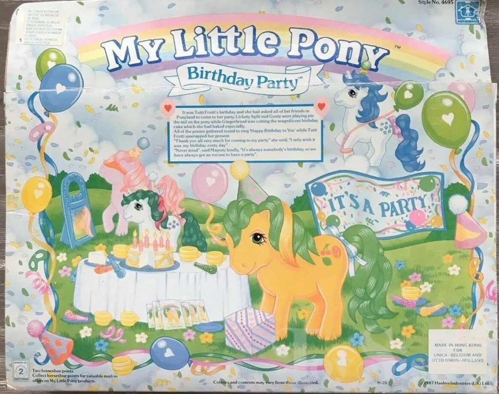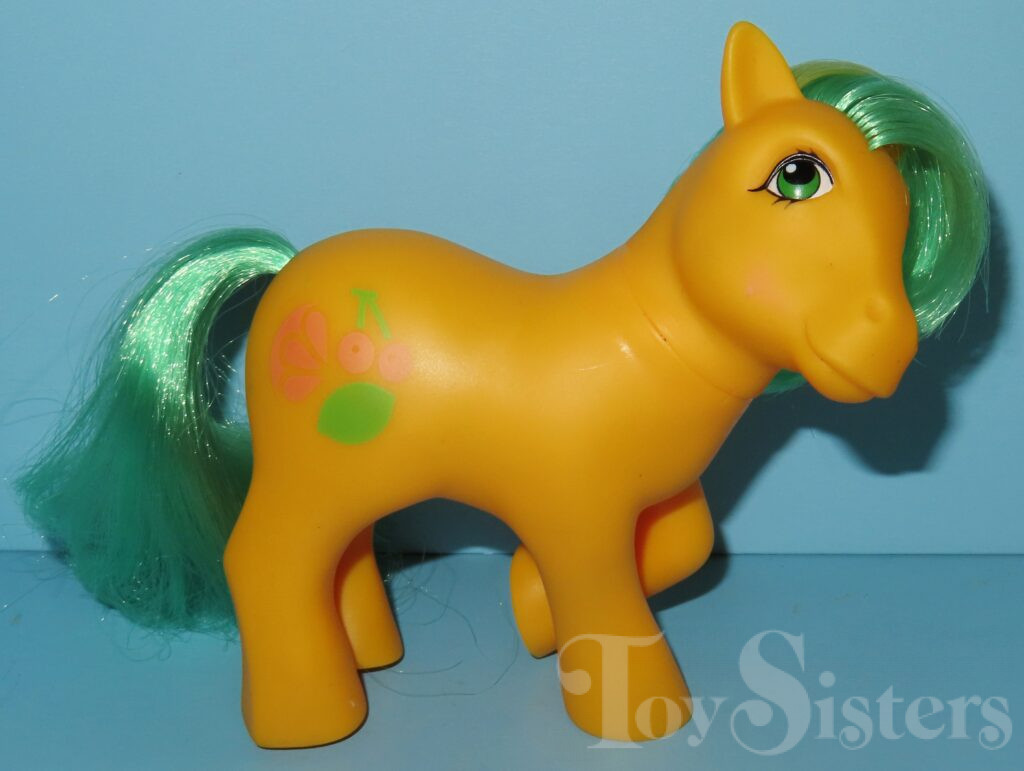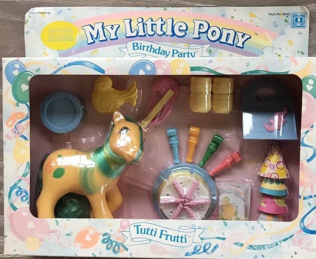 Tutti Frutti was released in Europe. She came in the Birthday Party set. She came with a stack of four party hats, four blowers (pink, blue, green, and orange), a large blue plate, four small blue plates, four yellow cups, a cake, six pink candles, a balloon, a pin the game, a party invitation, a yellow ribbon, a yellow bird brush, and pink moon comb. In some releases she came with different accessories that had six of everything. I recommend the My Little Pony Scrapbook website to learn more about the different releases of Tutti Frutti. She is in the Tootsie Pose. To view other ponies by year/series, click here.