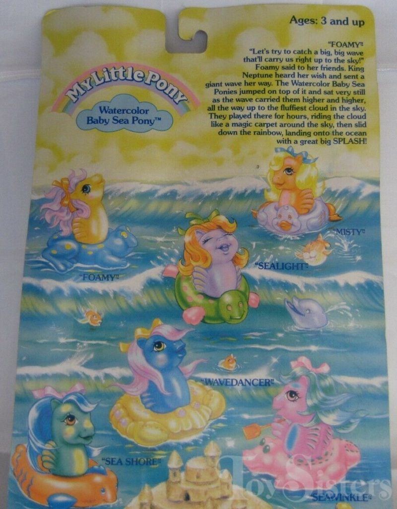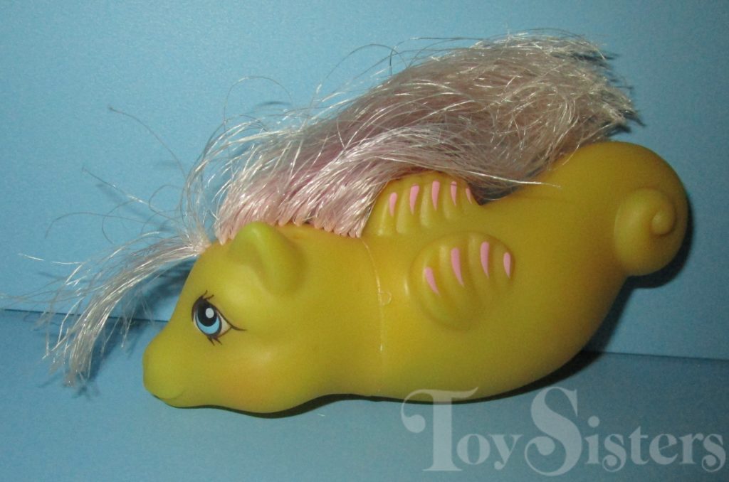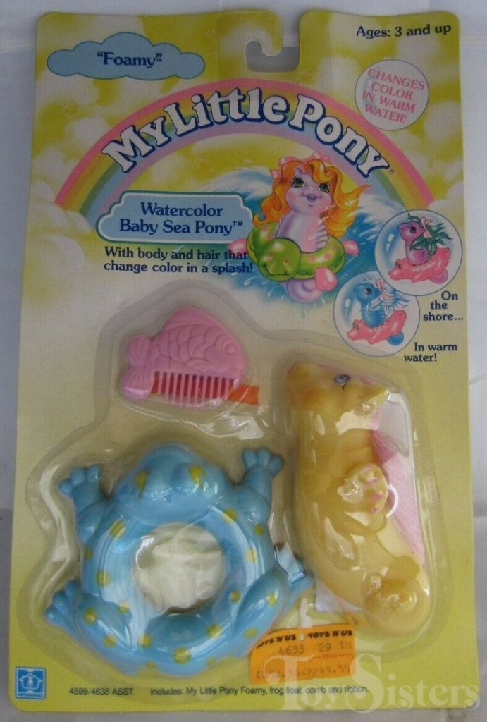 Foamy was released in 1988 and is a Baby Sea Pony. She came with a blue frog float, orange ribbon, and pink fish comb. She is in the Baby Foamy Pose. To view other ponies by year/series, click here.