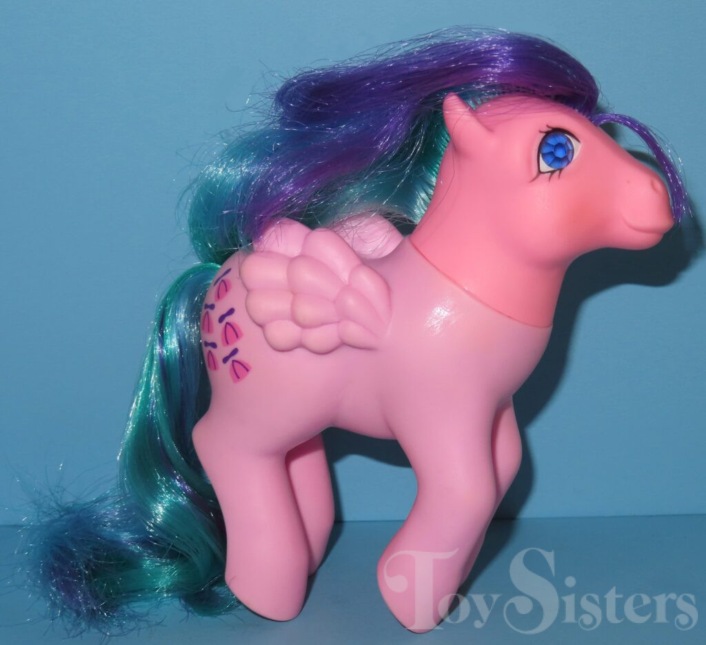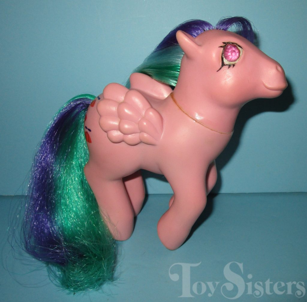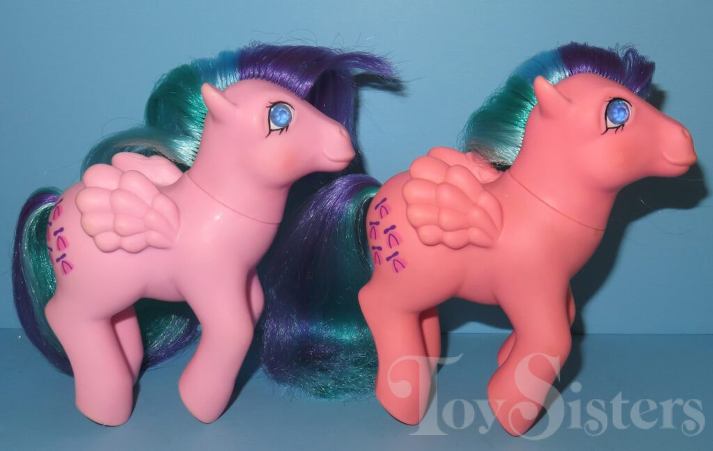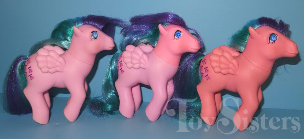 Whizzer was released in 1986 and is a Twinkle-Eyed Pony. She came with a white ribbon and purple shooting star comb. She has a darker pink body variation, that may or may not be related to regrind/plastic decomposition. The dark version does not appear streaky like most regrind ponies though. She is in the Bouncy Pose. To view other ponies by year/series, click here.