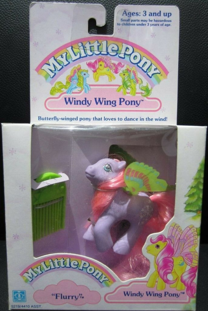 Flurry was released in 1989 and is a Windy Wing Pony. She came with a green sun comb. She is in the Flurry Pose. To view other ponies by year/series, click here.