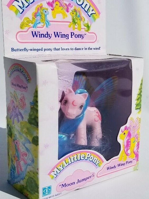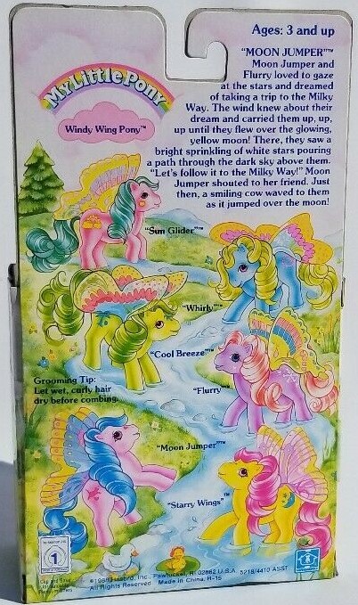 Moon Jumper was released in 1989 and is a Windy Wing Pony. She can have lighter or darker hair. She came with a pink sun comb. She is in the Glow Pose. To view other ponies by year/series, click here.