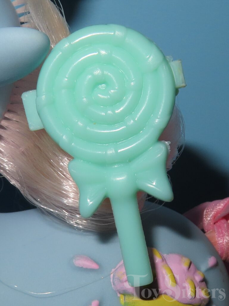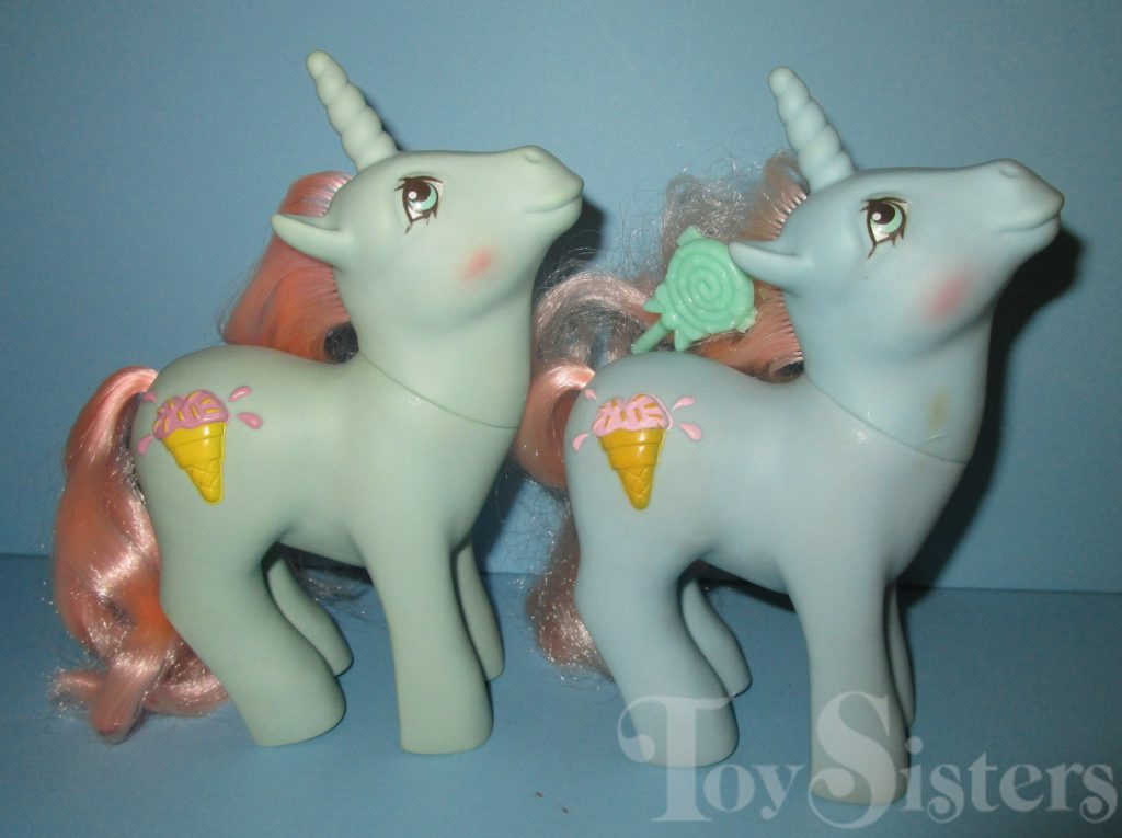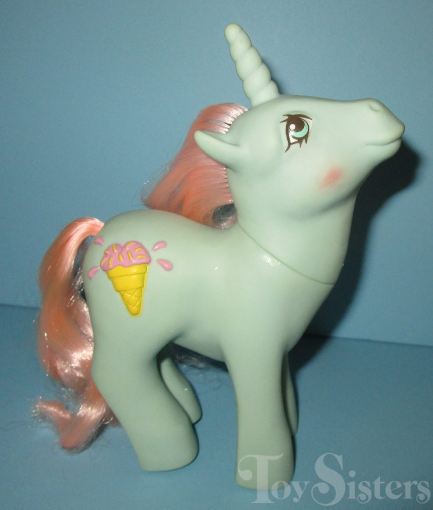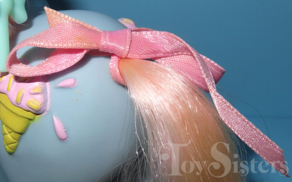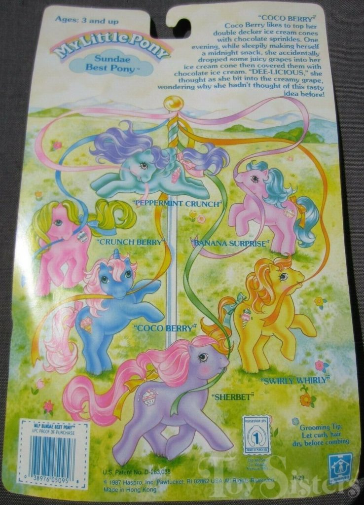 Coco Berry was released in 1988 and is a Sundae Best Pony. She came with a green lollipop barrette, purple comb, and a pink ribbon. In the United States she was made in Hong Kong. This version has pink hair that fades to white. In Europe, she can be found made in China. That version has pink hair that does not fade. In Germany, Coco Berry can be found with purple hair. That version is made in China as well. She is in the Powder Pose. To view other ponies by year/series, click here.